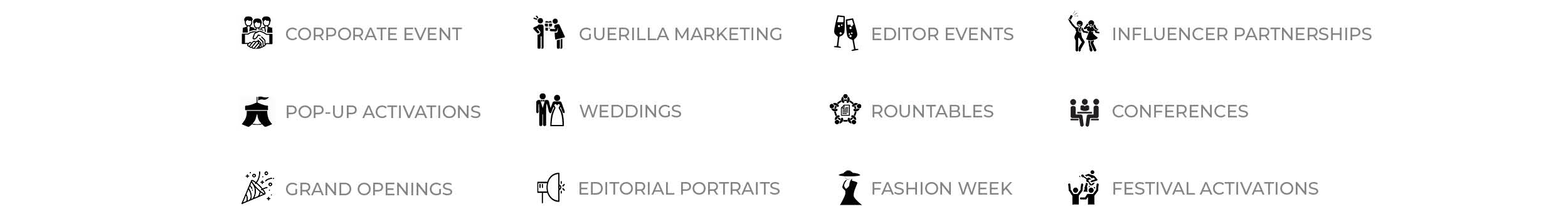 Our diverse and expansive list of clientele includes award-winning event and advertising agencies, PR and marketing firms, Fortune 500 companies and private clientele. Below is an abbreviated list of  some of the brands we’ve created for, both directly and through intermediate agencies or clients.